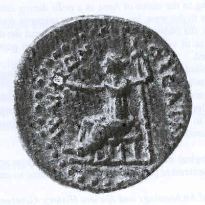η οποία κρατά στεφάνι και στηρίζεται σε σκήπτρο.